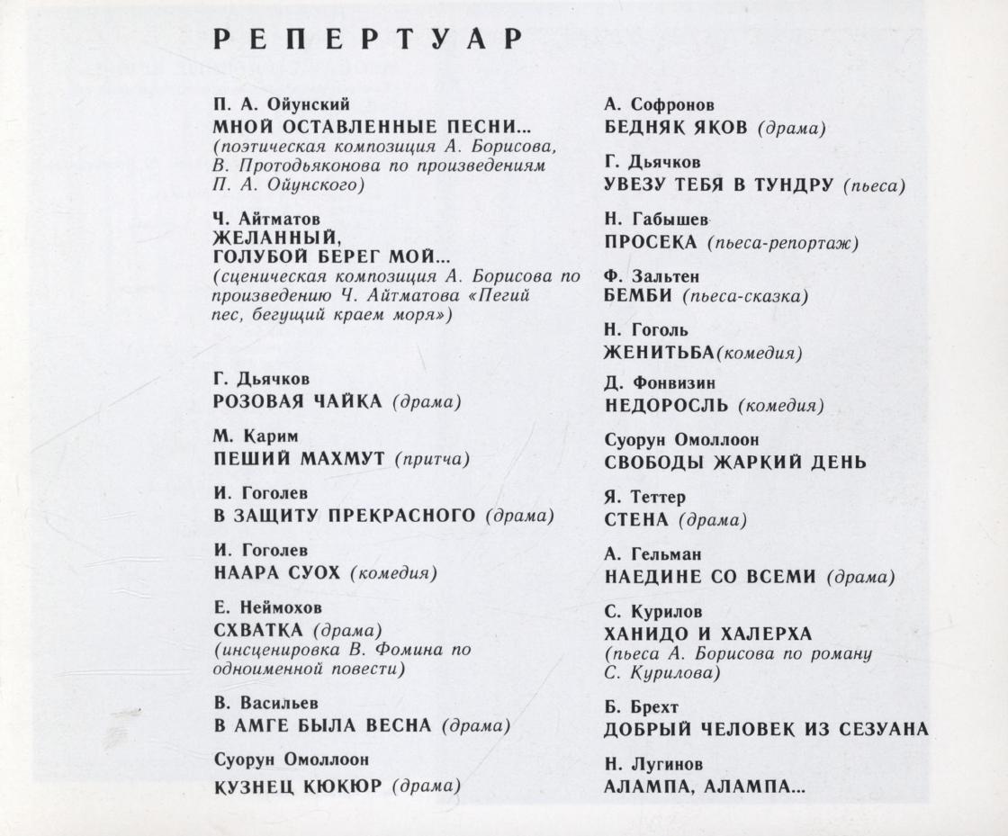 Якутский драматический театр имени П. А. Ойунского : альбом [составитель И. А. Дмитриев ; фотограф В. П. Яковлева]. - Якутск : Якутское книжное издательство, 1987. - [23] с.