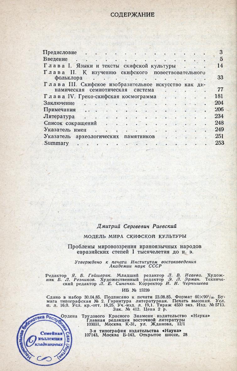 Модель мира скифской культуры : проблемы мировоззрения ираноязычных народов евразийских степей I тысячелетия до н. э. / Д. С. Раевский ; Академия наук СССР, Институт востоковедения. - Москва : Наука, 1985. - 256 с.