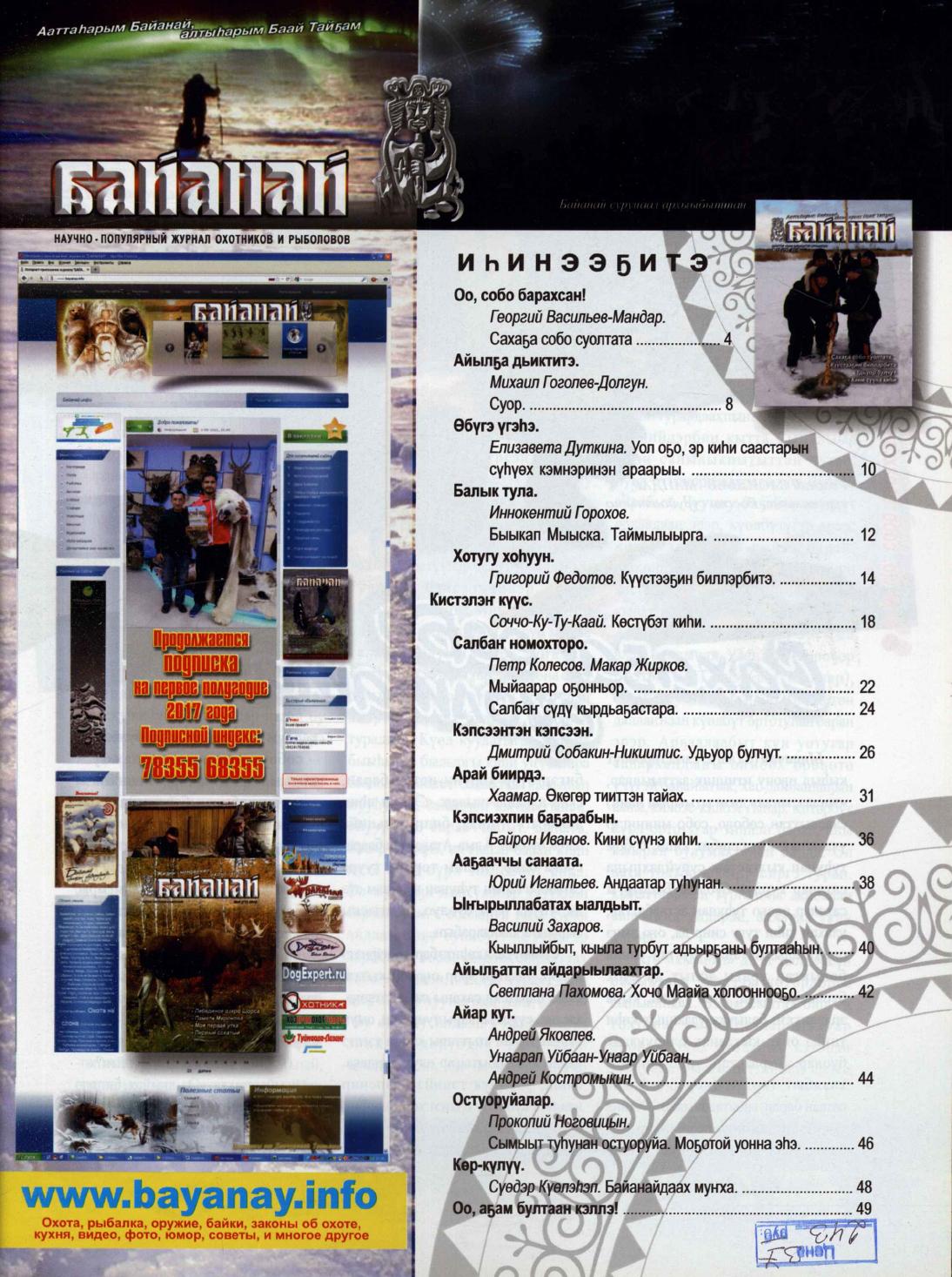 - 2. Байанай: научно-популярный журнал охотников и рыболовов: булчуттар уонна балыксыттар сурунааллара, 2016, №2 (70)