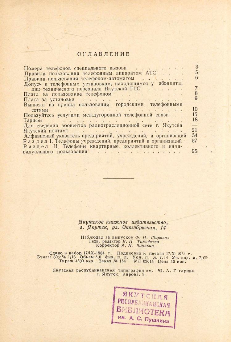 Список абонентов Якутской городской телефонной станции : (по данным на 1 июня 1964 г.) / Министерство связи СССР. - Якутск : Якутское книжное издательство, 1964. - 128 с. - 4500 экз.