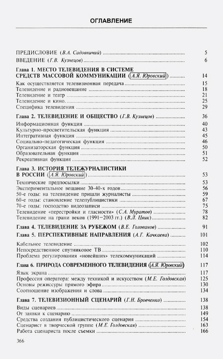 Телевизионная журналистика : учебник для студентов вузов, обучающихся по направлению и специальности "Журналистика" / [В. А. Садовничий, Г. В. Кузнецов, А. Я. Юровский и др.] ; редкол.: Г. В. Кузнецов, В. Л. Цвик, А. Я. Юровский ; Моск. гос. ун-т им. М. В. Ломоносова. - 5-е изд., перераб. и доп. - М. : Изд-во Моск. ун-та : Наука, 2005. - 366, [1] с.