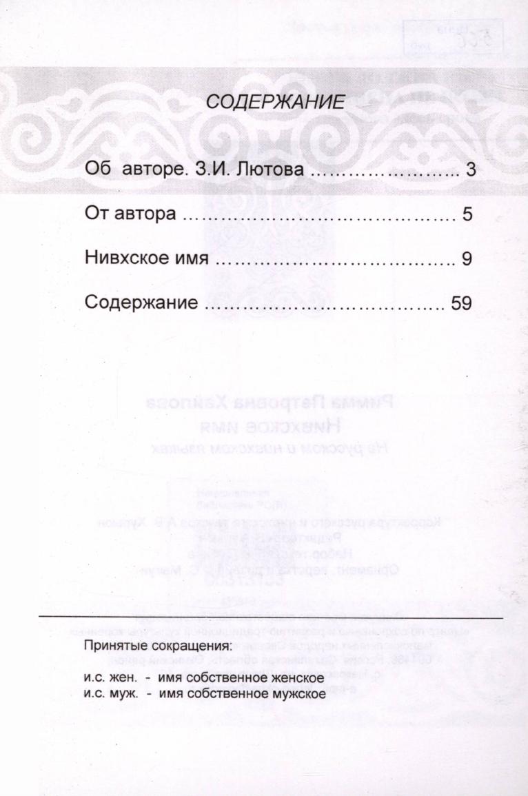 Нивхское имя : на русском и нивхском языке : [1297 личных имен] / Р. П. Хайлова ; [Охинская местная общественная организация "Центр по сохранению и развитию традиционной культуры коренных малочисленных народов Севера "Кыхкых" ("Лебедь")"]. - село Некрасовка, Охинский район : [б. и.], 2008. - 60 с.