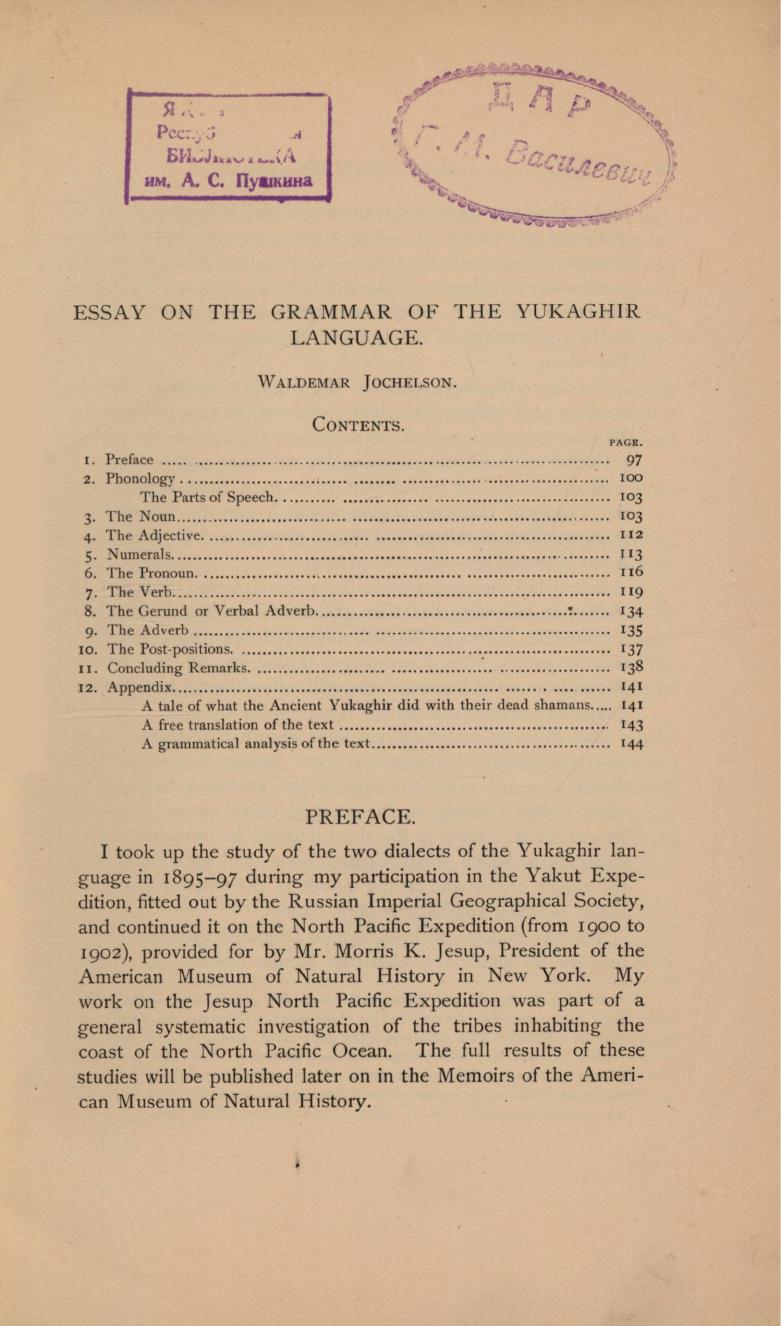 Essay on the grammar of the Yukaghir language / Waldemar Jochelson. - [New York : s. n., 1906?]. - 97 - 152 p. : map ; 21 см.