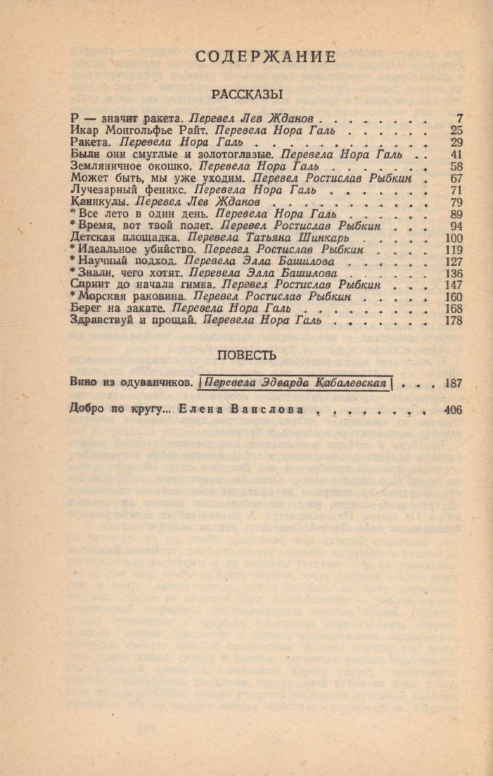 Передай добро по кругу : рассказы, повесть : [перевод с английского] / Рэй Брэдбери ; послесловие Е. Вансловой ; художник В. Юрлов. - Москва : Молодая гвардия, 1982. - 414 с. : ил. ).