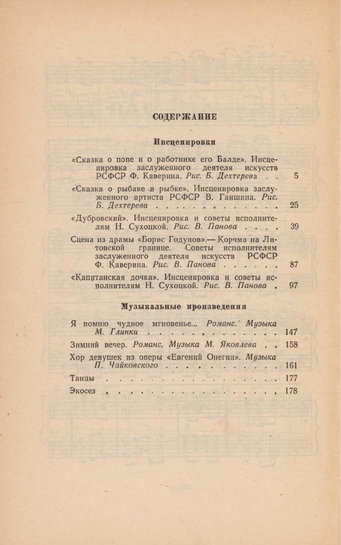 Помещены инсценировки произведений Пушкина и даны режиссерские советы к их постановке. В разделе "Музыкальные произведения" - песни и романсы на слова Пушкина и танцы пушкинского времени