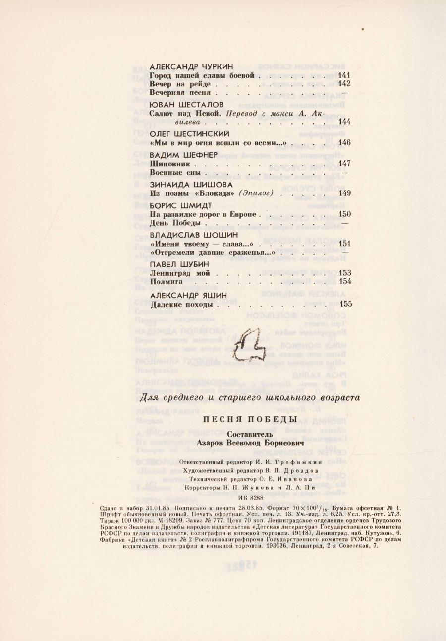 Песня Победы : стихотворения : [для среднего и старшего школьного возраста / составитель и автор вступительной статьи В. Азарова ; рисунки В. Бродского]. - Ленинград : Детская литература, 1985. - 159, [1] с.