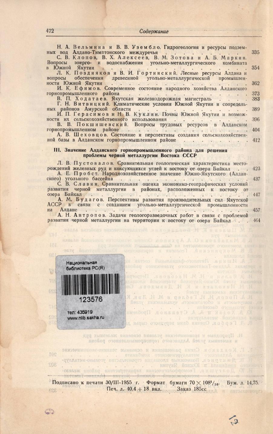 Проблема черной металлургии на базе руд и каменных углей Южной Якутии / Академия наук СССР, Совет по изучению производительных сил АН ССР, Якутская комплексная экспедиция ; редакционная коллегия: И. П. Бардин, В. С. Немчинов, Л. В. Пустовалов [и др.]. - Москва : Издательство АН СССР, 1955. - 472 с.