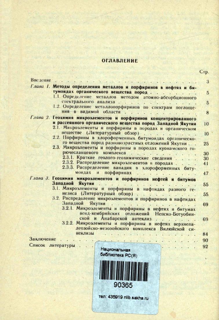 Геохимия порфиринов и микроэлементов органического вещества и нафтидов Западной Якутии / И. Н. Зуева, Н. А. Уткина, В. А. Каширцев, Т. А. Григорьева ; [ответственный редактор А. Ф. Сафронов] ; Российская академия наук, Сибирское отделение, Якутский институт геологических наук. - Якутск : Якутский научный центр СО РАН, 1992. - 99, [1] с.