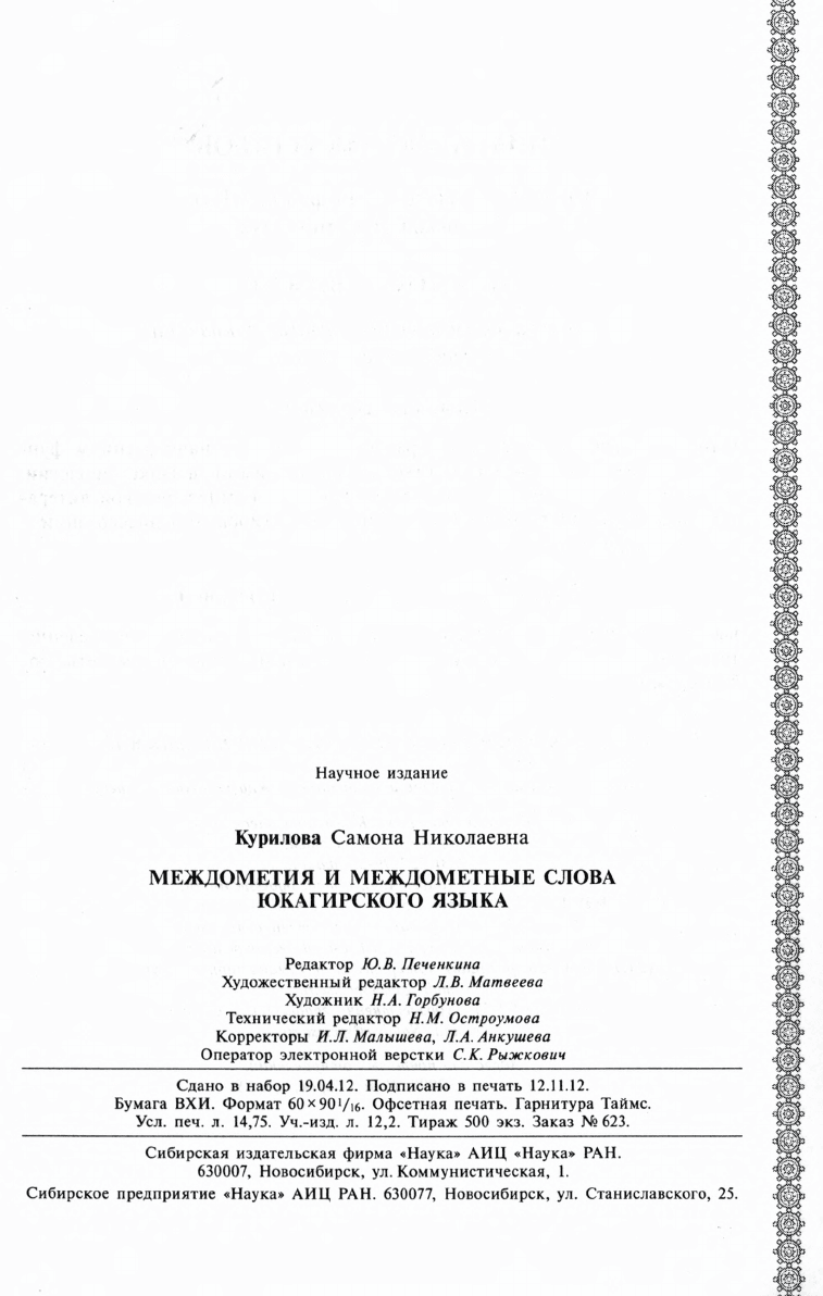 Монография посвящена описанию и анализу междометных единиц, употребляемых в речи тундровых и лесных юкагиров. Впервые предпринята попытка определения структурно-морфологических особенностей и функионально-семантического содержания междометий, установлена их роль в речевой коммуникации, что открывает перспективу в разработке проблематики юкагирских междометий