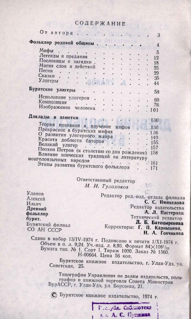 Древний фольклор бурят / А. Уланов ; ответственный редактор М. И. Тулохонов ; Академия наук СССР, Сибирское отделение, Бурятский филиал, Бурятский институт общественных наук. - Улан-Удэ : Бурятское книжное издательство, 1974. - 175, [1] с.