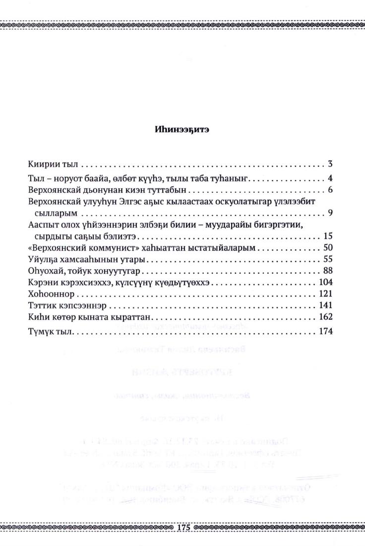 В книгу вошли воспоминания учителя якутского языка и литературы Лидии Тихоновны Васильевой из Балаганнахского наслега Верхневилюйского улуса, а также вошли сказы и статьи о жителях Верхоянского улуса