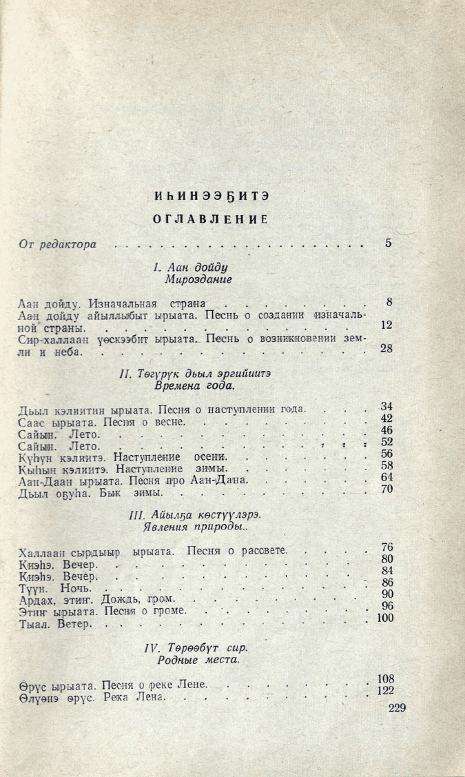В книгу включены якутские народные песни о мироздании, растительном и животном мире, о родных местах с переводом на русский язык, с примечаниями, комментариями