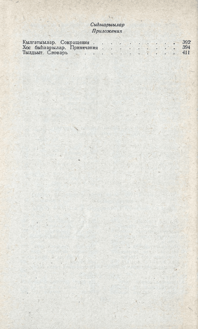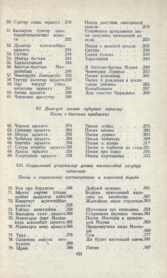 В сборник включены народные песни о скотоводстве, охоте, ысыахе, о любви, о социальном протесте и др. с переводом на русский язык, с комментариями