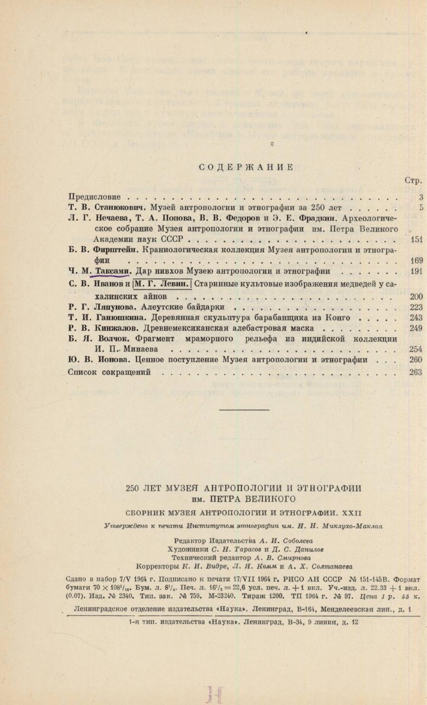 250 лет Музея антропологии и этнографии имени Петра Великого / Академия наук СССР, Институт этнографии им. Н. Н. Миклухо-Маклая ; [редколлегия: Л. П. Потапов (ответственный редактор) и др.]. - Москва ; Ленинград : Наука, 1964. - 262, [2] с., [1] л. (слож. в 2 с.) : ил., портр. ).