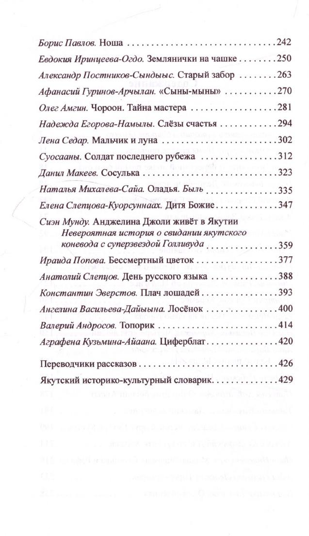 Якутский рассказ, составляющий ныне мощный пласт национальной культуры, рос и креп под влиянием русской словесности, развивая при этом собственный поиск новых тем и новых героев. В антологии малая якутская проза последних сорока лет представлена как сила формирующая, влияющая и во многом определяющая национальную идентичность и самосознание народа на стыке смены эпох - не только календарных, но и мировоззренческих. Сохраняя традиции, заложенные классиками, современные якутские прозаики, открытые к инонациональному художественному опыту, передают в своих произведениях своеобразие ментальности своего народа создают художественное разноцветье: от притчевости и мифологизированности до юмора и бытописания, от обыденности и назидательности до мудрой историчности, порой порождаемой публицистическим накалом