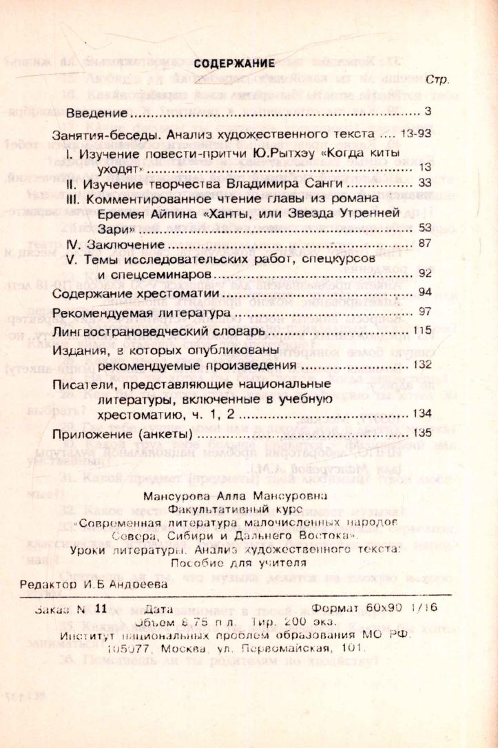 Факультативный курс "Современная литература малочисленных народов Севера, Сибири и Дальнего Востока" : уроки литературы. Анализ художественного текста : пособие для учителя / Институт национальных проблем образования, Федеральное целевая программа "Дети Севера". - Москва : ИНПО, 1995. - 137, [1] с.
