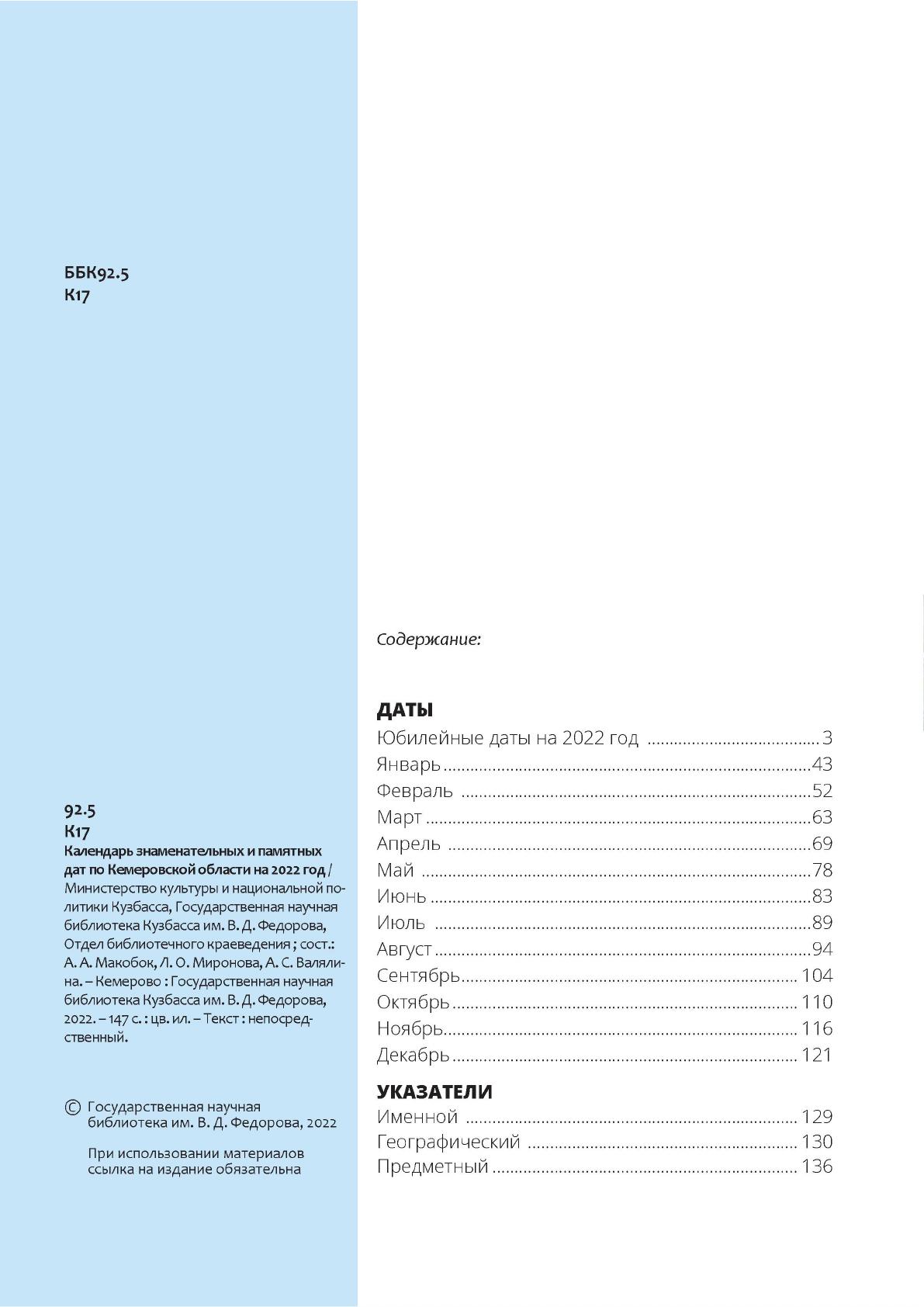 Очередное издание Календаря знаменательных и памятных дат по Кемеровской области познакомит вас с важными событиями 2022 года из политической, хозяйственной и культурной жизни региона. Источниками информации для календаря послужили книги, журналы и газеты, которые хранятся в фондах библиотек Кузбасса, а также сведения из Государственного архива Кемеровской области, Единого государственного реестра юридических лиц Российской Федерации, баз данных Территориального органа Федеральной службы государственной статистики по Кемеровской области и иных авторитетных источников. В этот календарь вошли только знаменательные и памятные даты кратные десяти и пяти. На некоторые события, что произошли ранее 1971 года, составлены фактографические и библиографические справки. Отдельное внимание заслуживает рубрика "Это интересно". Издание оснащено вспомогательным поисковым аппаратом-именным, предметным и географическим указателями
