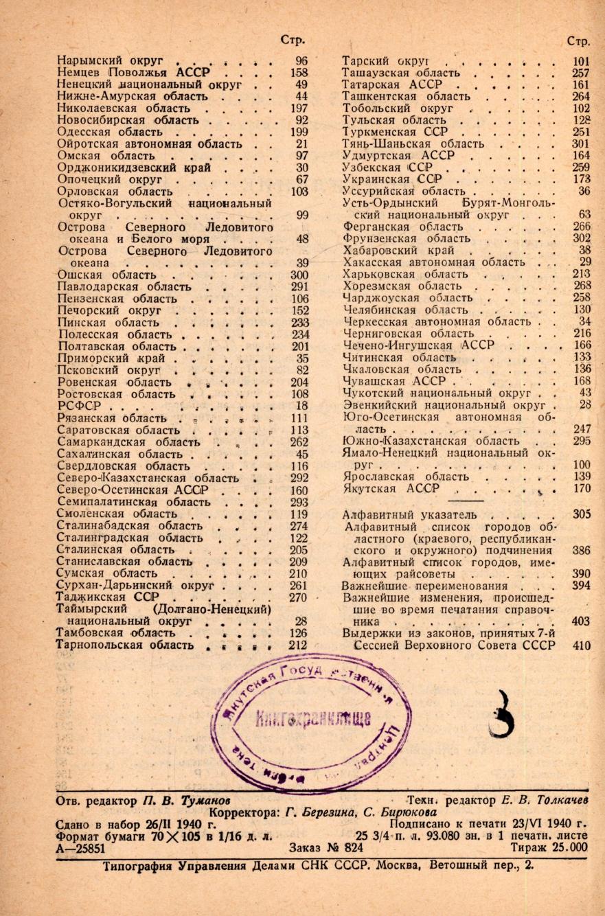 СССР : административно-территориальное деление союзных республик на 1 мая 1940 года / Информационно-статистический отдел при Секретариате Президиума Верховного Совета СССР ; [ответственный редактор П. В. Туманов]. - 2-е изд., доп. - Москва : Издательство "Ведомостей Верховного Совета РСФСР", 1940. - 412 с.