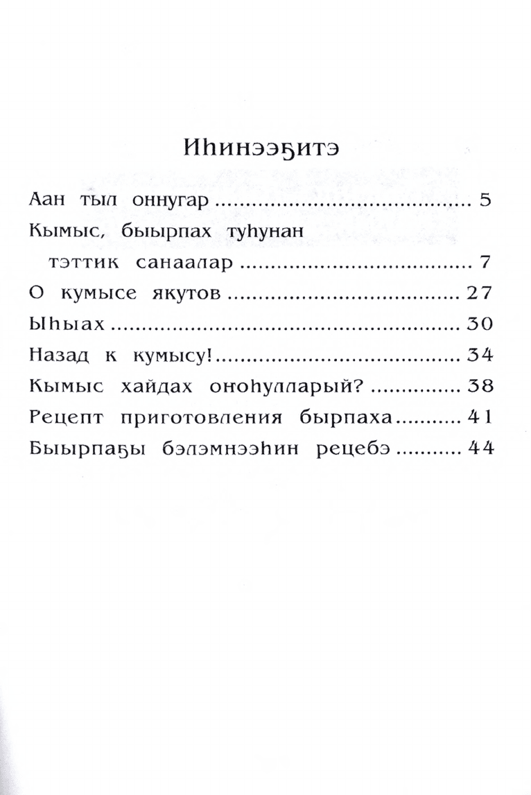 Брошюра посвящена распространенным с древнейших времен кисломолочным продуктам (напиткам) якутов: кумысу, бырпаху и др. Автор собрал ранее опубликованные материалы (выдержки из книг, статьи) о кумысе о других кисломолочных продуктах, широко использовавшихся у якутов как основной вид напитков и пищи