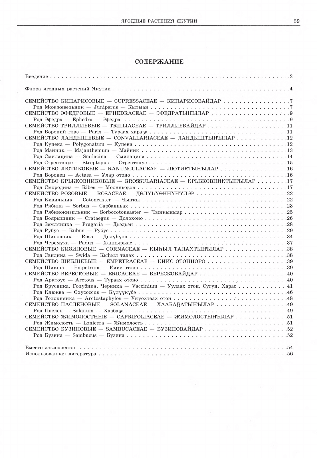 В книге дана характеристика 50 видов ягодных растений из 24 родов покрытосеменных, 5 видов из 2 родов голосеменных, имеющих семена с сочными оболочками, произрастающих на территории Якутии в следующем плане: ареал в Якутии, морфологические, биологические и экологические особенности, приобретенные в эволюционном процессе адаптации к суровым климатическим, почвенным и мерзлотным условиям; роль в природе и использование в народном хозяйстве, медицине и быту