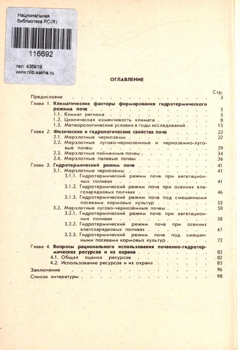 В монографии обобщены результаты многолетних исследований агрофизических свойств и гидротермического режима почв бассейна р. Амги. Впервые освещаются данные, характеризующие влияние позднеосенних вегетационных поливов на влагообеспеченность кормовых культур и ярового ячменя. Обосновывается положение о применении вегетационных поливов по критическим фазам развития растений, о нецелесообразности дождевального орошения мерзлотных палевых почв данного региона и о выделении мерзлотных черноземов долины р. Амга в разряд особо охраняемых почв мерзлотных областей