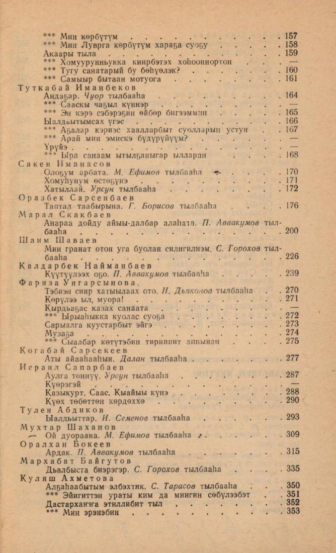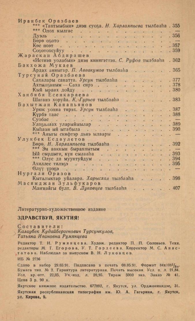 Эҕэрдэ, Саха сирэ! = Сэлем, Саха елi! : билиҥҥи казах суруйааччыларын айымньылара / [хомуйан оҥордулар: Калаубек Турсункулов, Татьяна Румянцева]. - Дьокуускай : Саха сиринээҕи кинигэ издательствота, 1991. - 412, [4] с.