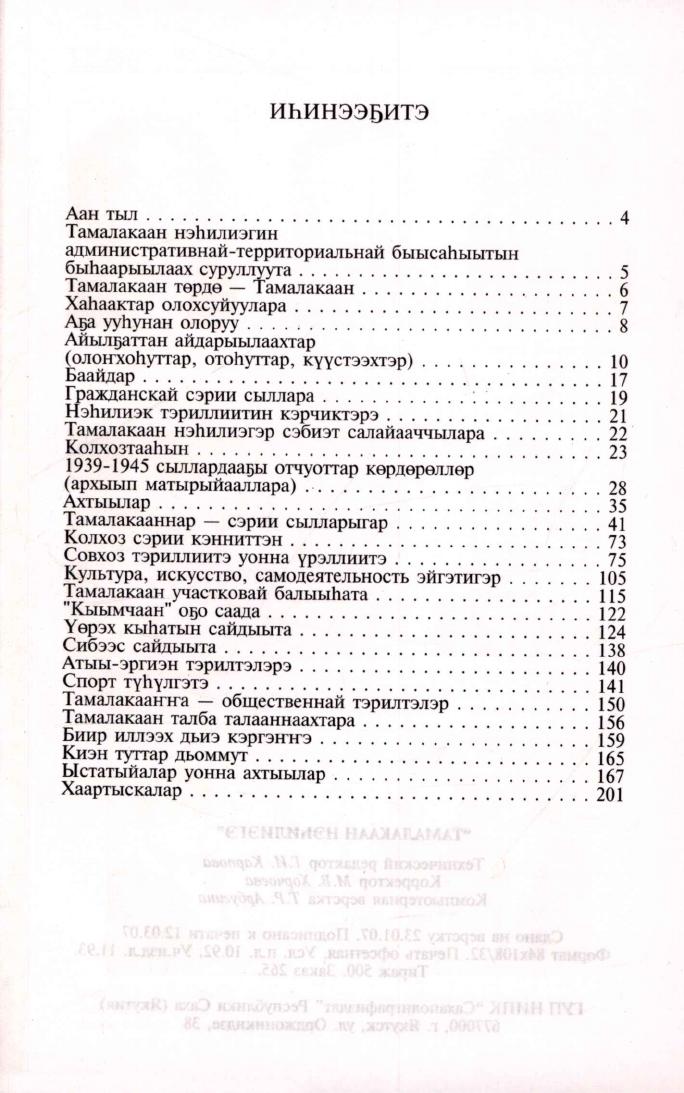 Тамалакаан нэһилиэгэ / Саха Республикатын "Үөһээ Бүлүү улууһа (оройуона)" муниципальнай тэриллии дьаһалтата ; [матырыйаалы хомуйан бэлэмнээтэ Н. Т. Анисимова ; редакционнай коллегия: М. М. Донской, О. Д. Федорова]. - Дьокуускай : Сахаполиграфиздат, 2006 [т.е. 2007]. - 206, [1] с.