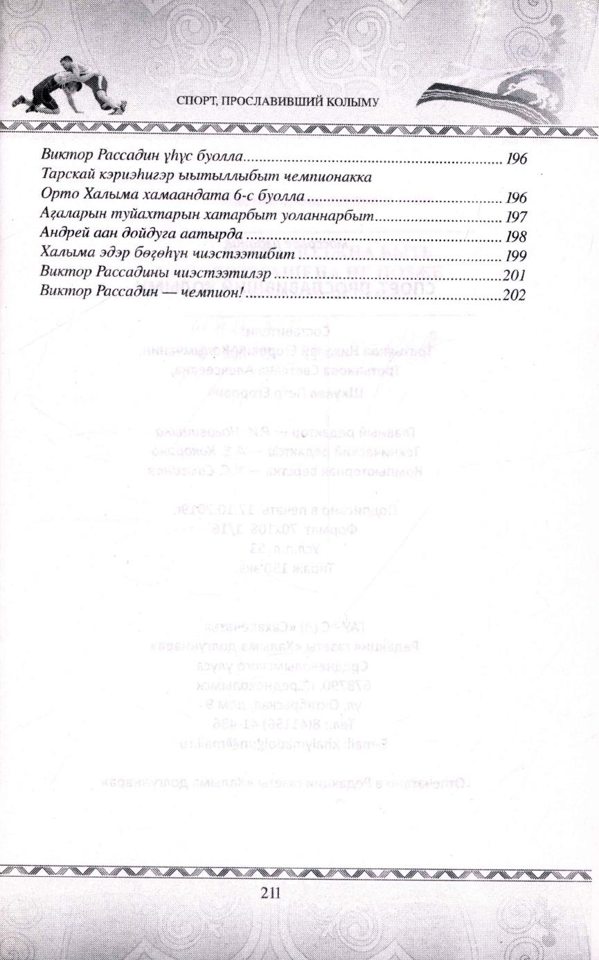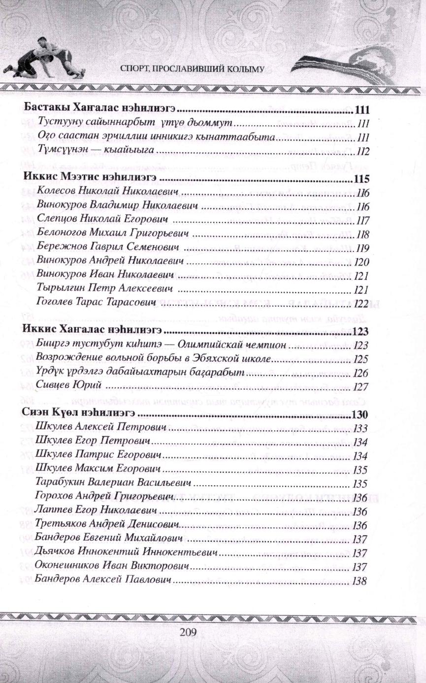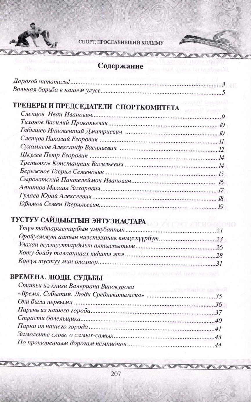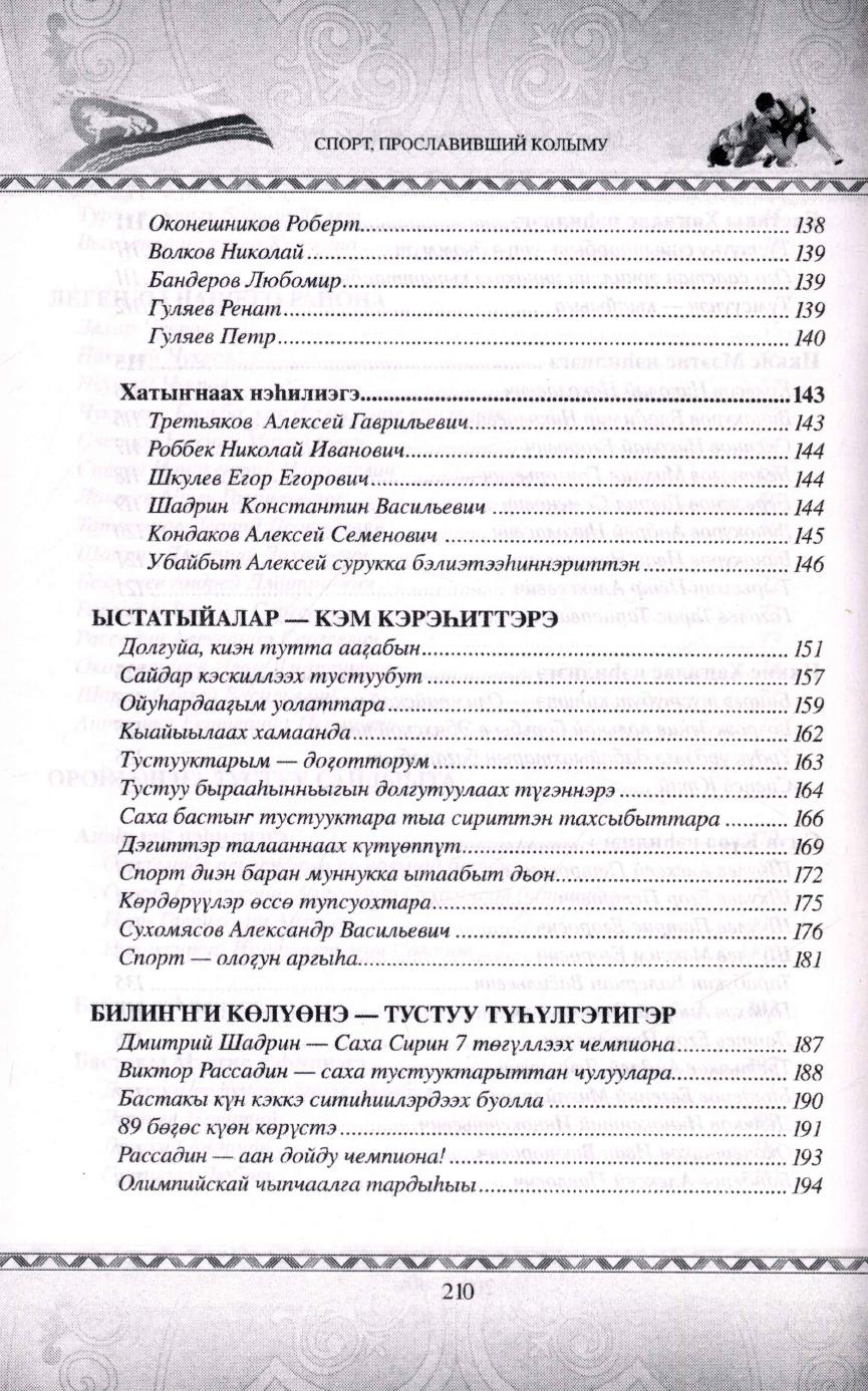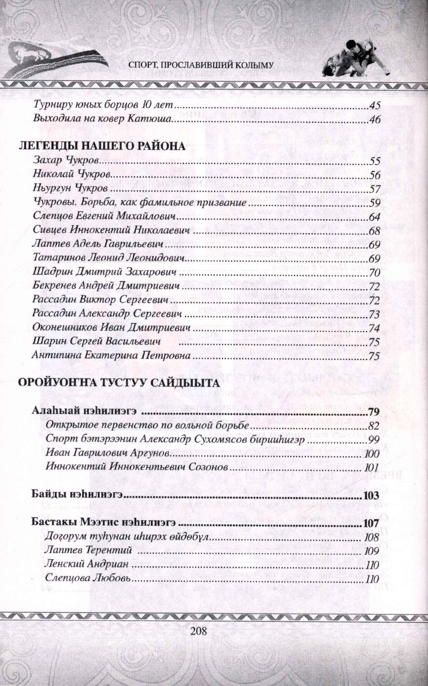 Книга посвящена зарождению и развитию вольной борьбы в Среднеколымском улусе. В книгу вошли рассказы и воспоминания о первых турнирах, чемпионах за весь период существования данного вида спорта. Это 60-летняя летопись развития вольной борьбы в нашем улусе
