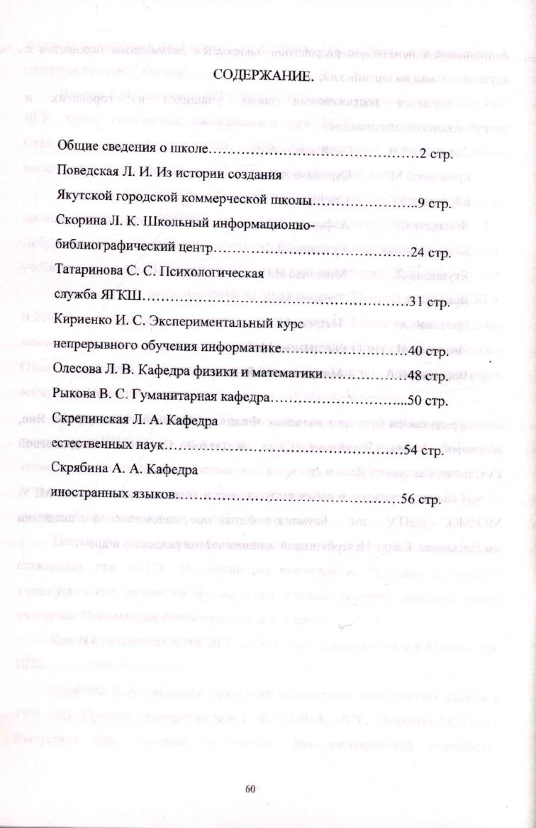 В книге содержится информация об истории создания и развития Якутской городской коммерческой школы-лицея с 1991-2001 гг., говорится о том, что за это время ЯГКШ стала одним из известных учебных заведений в городе, приобрела авторитет среди родителей, учащихся и педагогической общественности. Говорится о преподавателях ЯГКШ, основных направлениях деятельности школы
