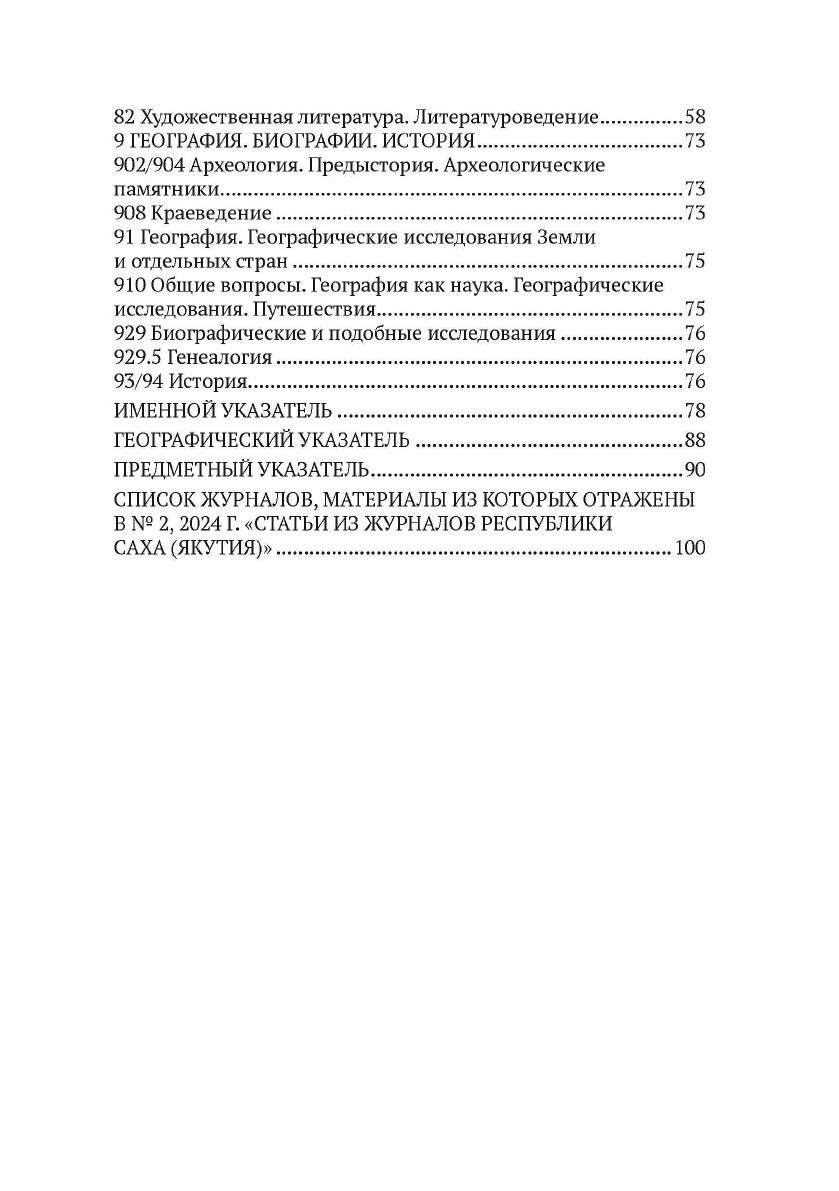 Статьи из журналов Республики Саха (Якутия) : государственный библиографический указатель = Саха Өрөспүүбүлүкэтин сурунаалларыгар киирбит ыстатыйалар : судаарыстыбаннай библиографическай ыйынньык / Министерство культуры и духовного развития Республики Саха (Якутия), Национальная библиотека Республики Саха (Якутия), Национальное библиографическое агентство. - Якутск : СРИД НБ РС(Я), 2018- .2024, N 2 (313-755). - 2024. - 1 файл (104 с. ; 56 Mб).