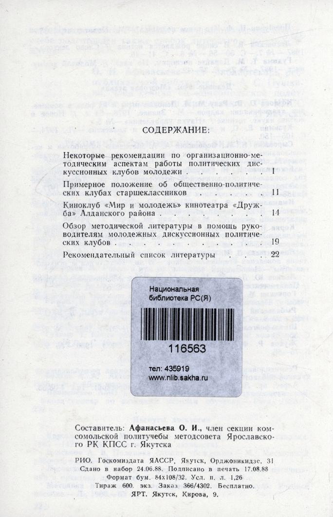 Методические рекомендации в помощь организаторам политической учебы молодежи / Дом политического просвещения Якутского обкома КПСС ; [составитель О. И. Афанасьева]. - [Якутск : б. и., 1988]. - 22, [2] с.