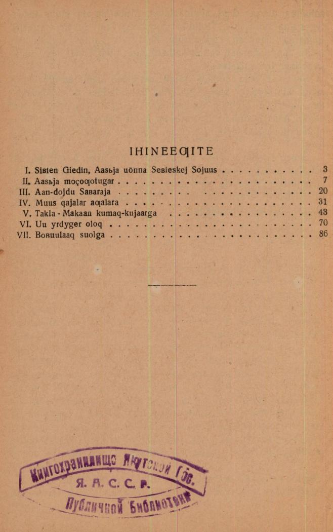 Аасыйа күнүн анныгар : Сибиэн Гиэдин айана / Н. Хаарынсап ; С. Н. Донускуой I тылб. - Москуба : Судаарыстыба үөрэх-бэдэгиэгикэ кинигэтин бэчээтэ, 1935. - 102 [2], с. : ил. ; 20 см. -.- 10000 экз.