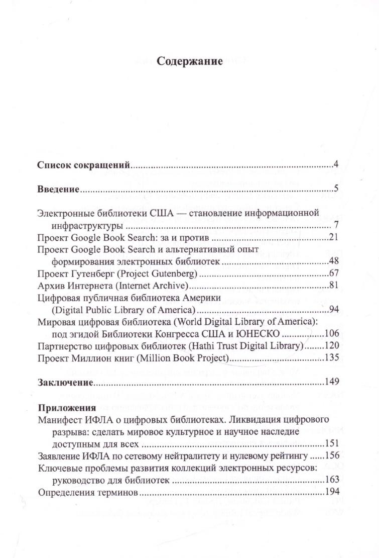 В монографии анализируется история возникновения и основные структурно-функциональные особенности крупнейших электронных библиотек США, а также новые принципы их коллективного сотрудничества в процессе формирования инфраструктуры информационного общества. Отдельные главы посвящены Google Book Search, Проекту Гутенберг, Архиву Интернета, Цифровой публичной библиотеке Америки, Мировой цифровой библиотеке, Партнерству цифровых библиотек Hathi Trust, Проекту Миллион книг. В Приложениях приводятся документы IFLA, регламентирующие деятельность электронных библиотек