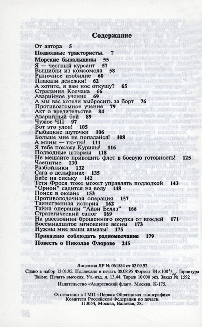 Автор этих документально-художественных повестей, рассказов, миниатюр — контр-адмирал в отставке Анатолий Тихонович Штыров. 20 лет он проплавал на подводных лодках, из них командиром — 8 лет. Еще 20 лет прослужил на штабной работе в системе разведки и планирования морских операций. Это его третья книга. Она включает остросюжетные, интересные истории, написанные сочным, соленым языком, часто о неведомых нам событиях, упоминание которых прежде допускалось лишь под грифом “Совершенно секретно”