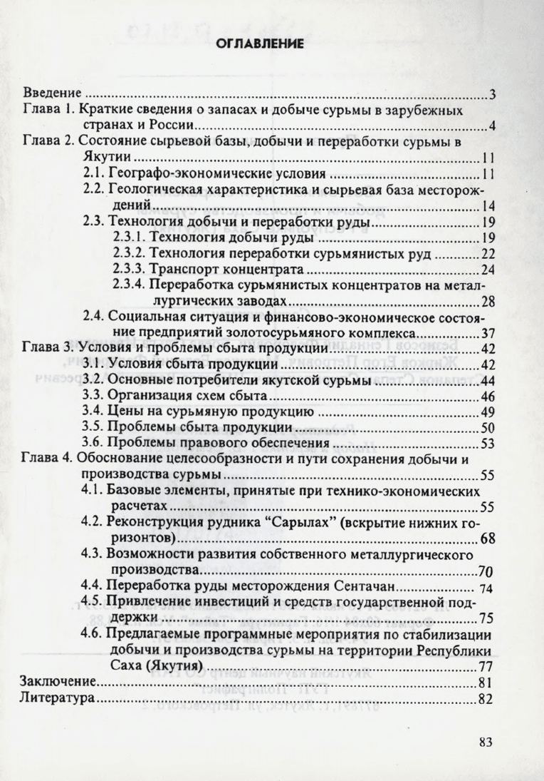 Состояние и пути сохранения добычи и производства сурьмы в Республике Саха (Якутия) / Рос. акад. наук, Сиб. отд-ние, Якут. науч. центр, Ин-т горн. дела Севера ; [сост.: Г. Ф. Безносова и др. ; отв. ред. д.т.н., проф. С. А. Батугин]. - Якутск : Изд-во ЯНЦ СО РАН, 1999. - 83 с.