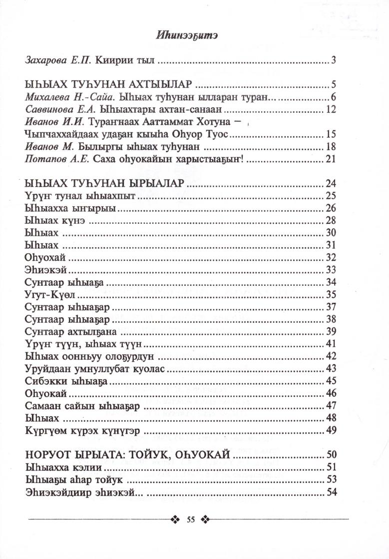 Уйгулаах сайыммыт ыһыаҕар : ыһыах туһунан ырыалар, Сунтаар улууһун олохтоохторун ахтыылара / Өксөкүлээх Өлөксөй аатынан республикатааҕы норуот айымньытын методическай уонна социально-культурурнай киинэ ; [хомуйан оҥордо Е. П. Захарова]. - Дьокуускай : СГУ изд-вота, 2006. - 55 с.