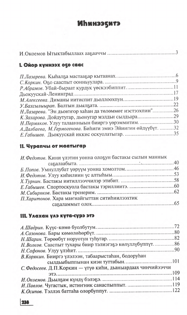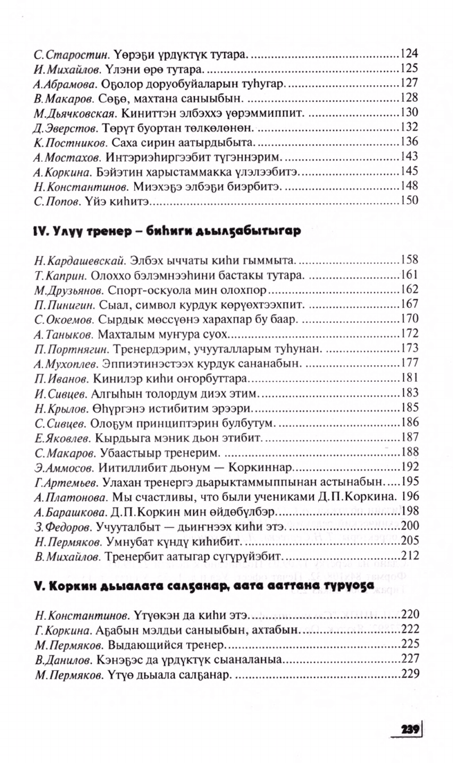 Бу кинигэ Саха сирин уһулуччулаах тренерэ Д.П. Коркин төрөөбүтэ 75 сылыгар ананар. Манна араас кэмҥэ хаһыаттарга, кинигэлэргэ бэчээттэммит ыстатыйалар уонна Дмитрий Петрович аймахтарын, чугас доҕотторун, бииргэ үлэлээбит дьонун, үөрэппит оҕолорун ахтыылара киирдилэр