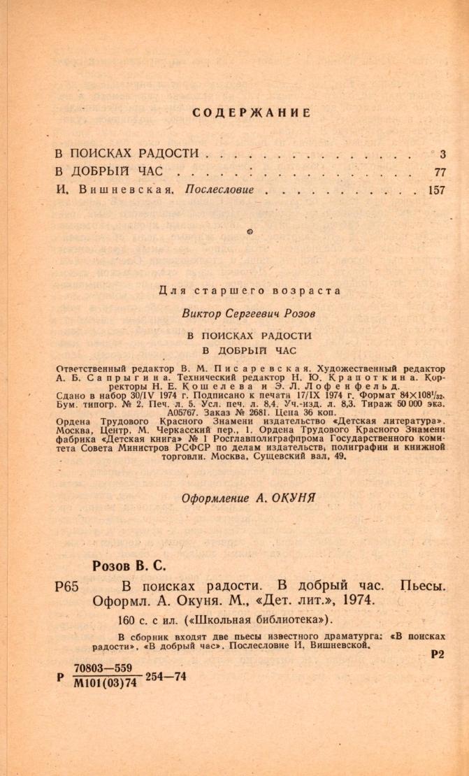 В поисках радости ; В добрый час : пьесы : [для старшего школьного возраста] / В. Розов. - Москва : Детская литература, 1974. - 158, [1] с.