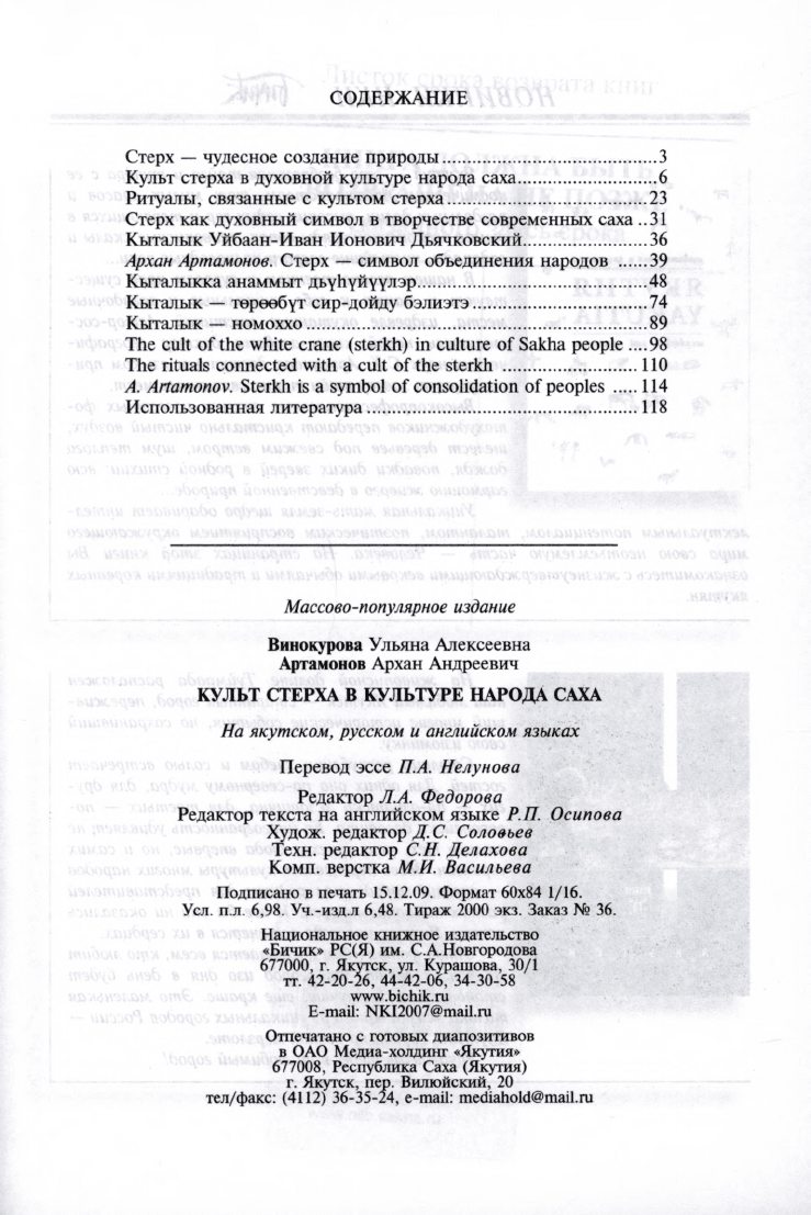 В книге раскрывается один из малоизученных культов в духовной культуре народов саха - почитание красивейшей птицы планеты - стерха (белого журавля). Стерх является общепринятым олицетворением красоты у народов Якутии. Птица, занесенная в Красную книгу, обитает и выводит птенцов на арктической территории республики, где пользуется защитой и благовейным отношением коренных народов. Издание иллюстрировано художественными образами стерха, созданными детьми, студентами-художниками и мастерами народного творчества. В книгу вошли стихи известных поэтов и народные предания о стерхе