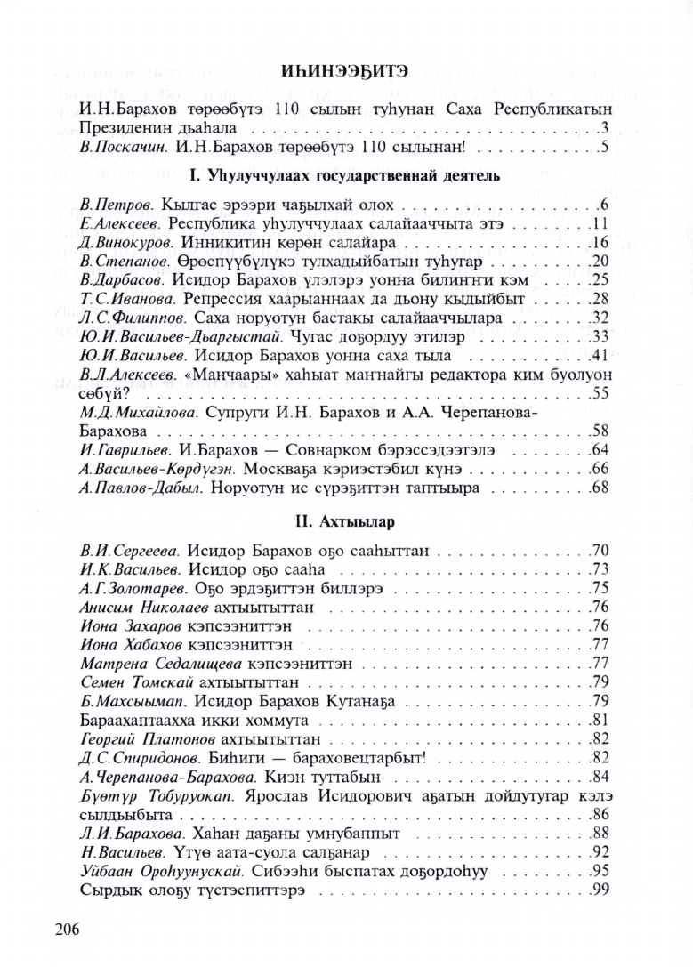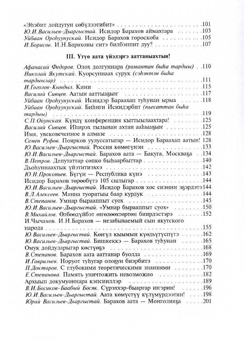 Исидор Барахов : [төрөөбүтэ 110 сылын көрсө : ыстатыйалар уонна ахтыылар / хомуйан оҥордулар: Ю. И. Васильев-Дьаргыстай, В. Д. Михайлов]. - Дьокуускай : Бичик, 2008. - 206, [2] с., [8] л. ил.