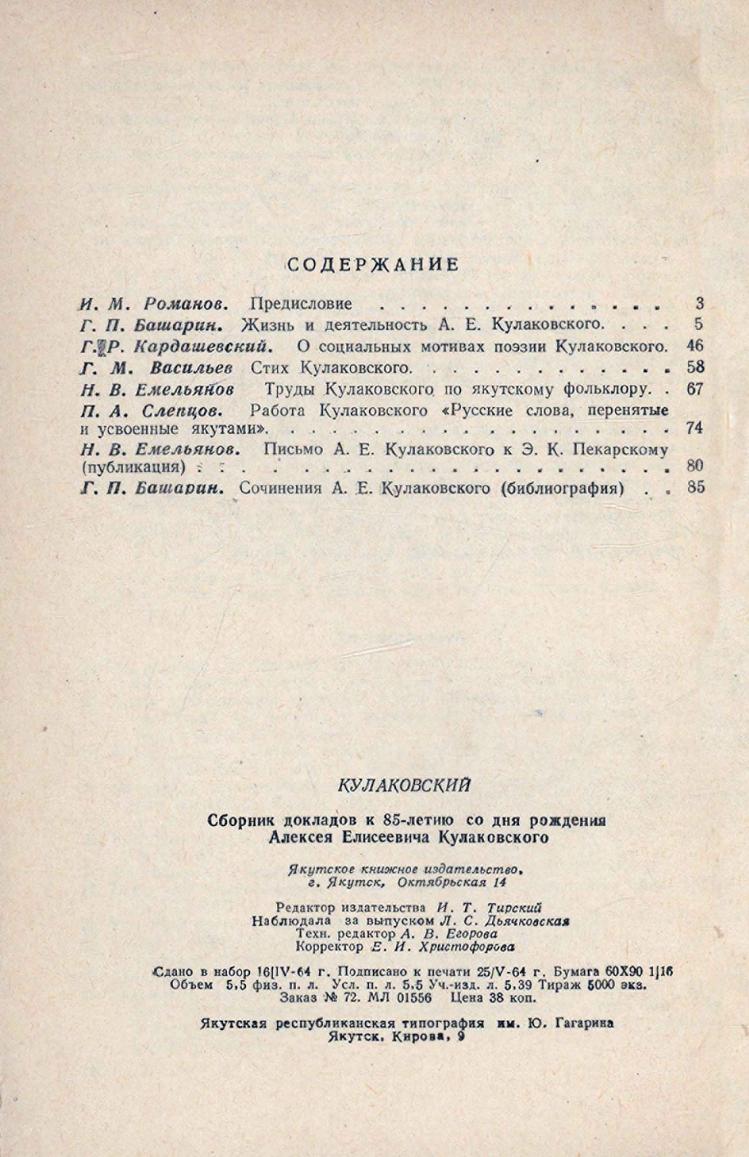 Кулаковский : сборник докладов к 85-летию со дня рождения Алексея Елисеевича Кулаковского / [редактор проф. Г. П. Башарин ; предисловие И. М. Романов]. - Якутск : Якутское книжное издательство, 1964. - 86, [2] с.