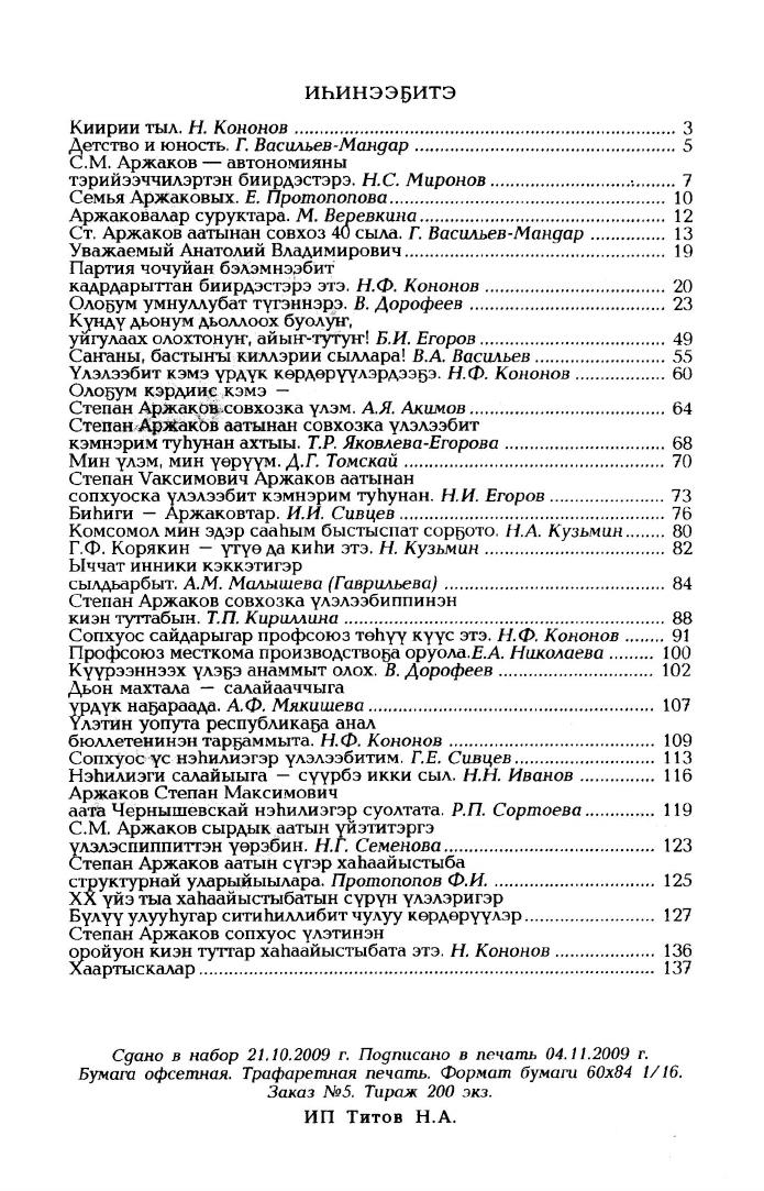 Сырдык аатын кэриэстээн / [хомуйан оҥордо Н. Ф. Кононов]. - Бүлүү, 1999 -. - 20 см. Книги посвящены истории Совхоза им. Степана Аржакова, 100-летию видного государственного и политического деятеля Якутской АССР С. Аржакова. Кн. 2. - 2009. - 143, [1] с.