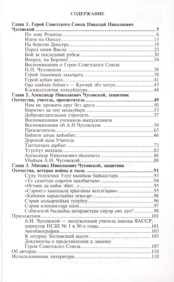 В книгу вошли воспоминания коллег, друзей и близких родственников Героя Советского Союза Н. Н. Чусовского и воина, учителя и просветителя А. Н. Чусовского, также ветерана войны и тыла М. Н. Чусовского