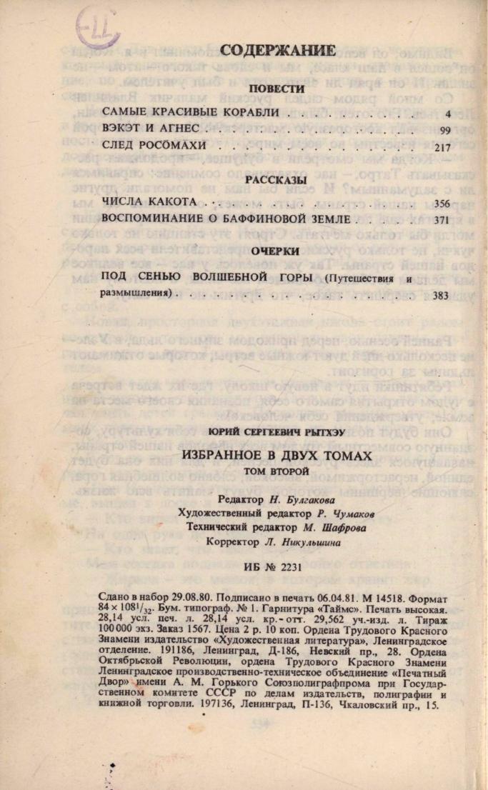 Избранное : в 2 томах / Юрий Рытхэу. - Ленинград : Художественная литература, 1981. - 21 см. Т. 2: Повести, рассказы, очерки. - 1981. - 534, [1] с. Содерж.