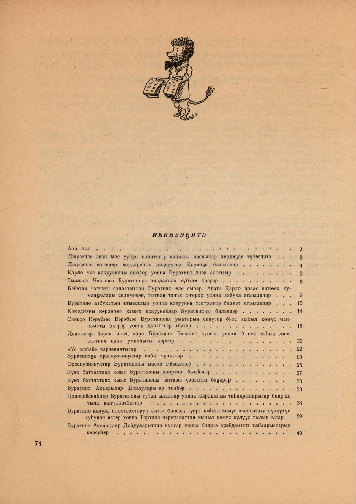 Кыһыл Көмүс күлүүс тыла, эбэтэр Буратино мүччүргэннээх сырыылара / А. Толстой ; [перевод: Е. С. Никифорова и Р. С. Попова]. - Сахалыы 2-с тахсыыта. - Якутскай : Саха сиринээҕи кинигэ издательствота, 1967. - 74, [1] с.