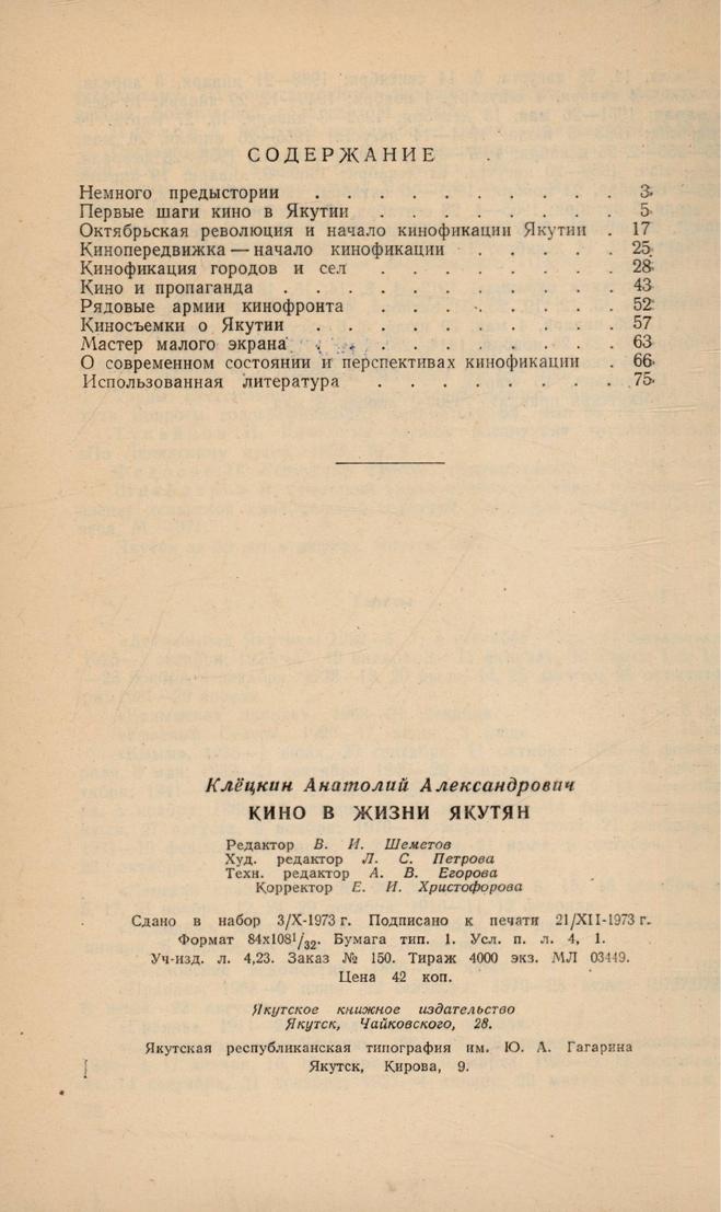 Кино в жизни якутян / А. А. Клецкин ; [редактор д.и.н., проф. И. М. Романов]. - Якутск : Якутское книжное издательство, 1973. - 78, [1] с.