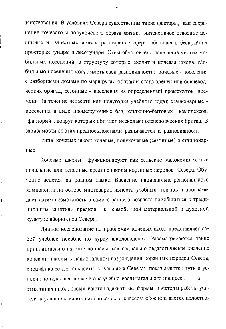 Данное исследование по проблемам кочевых школ представляет собой учебное пособие по курсу школоведения. Рассматриваются такие принципиально важные вопросы, как социально-педагогическое значение кочевой школы в национальном возрождении коренных народов Севера, специфика ее деятельности в условиях Севера; показываются пути и условия по повышению качества учебно-воспитательного процесса в этих типах школ, раскрываются адекватные формы и методы работы учителя в условиях малой наполняемости классов; обосновывается целостная концепция о деятельности кочевой школы как наиболее оптимальной и мобильной формы школьной сети в местах компактного проживания малочисленных народов Севера