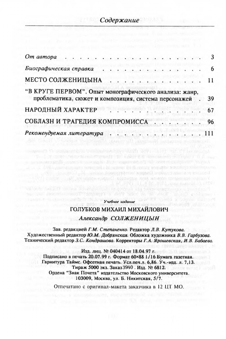 В пособии дан конкретный анализ произведений А. И. Солженицына - художественных и публицистических. Роман "В круге первом" представлен в более широком контексте написанного Солженицыным - рассказов 1960-1990-х годов, "Архипелага ГУЛага" и эпопеи "Красное колесо". Особое внимание уделено религиозно-философским взглядам писателя, которые помогают понять и его концепцию русского национального характера, и его историософию, и принципиальную общественную позицию, занятую им по возвращению в Россию