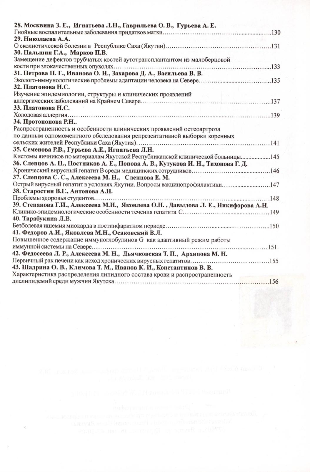 Достижения и перспективы медицинской науки в Республике Саха (Якутия) : материалы республиканской научно-практической конференции, посвященной 5-летию образования Института здоровья Академии наук Республики Саха (Якутия), 16 июня 2001 г. / [под редакцией В. Г. Кривошапкина]. - Якутск : Издательство ДНиСПО МО РС(Я), 2002. - 162, [1] с.