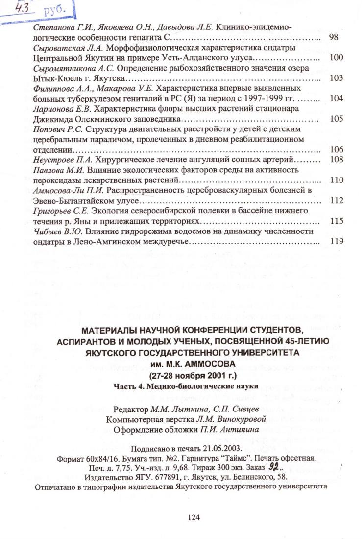 Материалы научной конференции студентов, аспирантов и молодых ученых, посвященной 45-летию Якутского государственного университета им. М. К. Аммосова, (27-28 ноября 2001 г.) / [редколлегия: В. Ю. Фридовский]. - Якутск : Издательство ЯГУ, 2003. - 20 см.